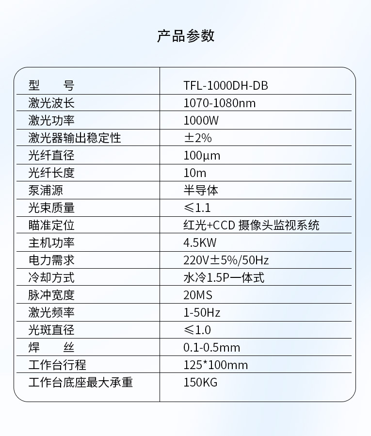 采用光纖激光器,反射率高,能量強(qiáng),免維護(hù),免調(diào)光,功耗少,相比傳統(tǒng) 模具焊來(lái)說(shuō),體積小,安全,穩(wěn)定性好超長(zhǎng)使用壽命。 1000W光纖激光器,滿足銅、鋁焊接量大的模具及產(chǎn)品焊接加工需要。 高承重底座及工作臺(tái),保持輕便靈活的優(yōu)點(diǎn),同時(shí)提供更高承載能力。 配備.1.5P大功率一體式水冷水機(jī),保證了大功率焊接的穩(wěn)定性。